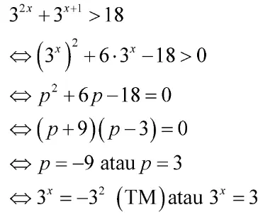 Mula-mula, ubah pertidaksamaan eksponen tersebut ke dalam bentuk pertidaksamaan kuadrat dengan memisalkan 3x = p.