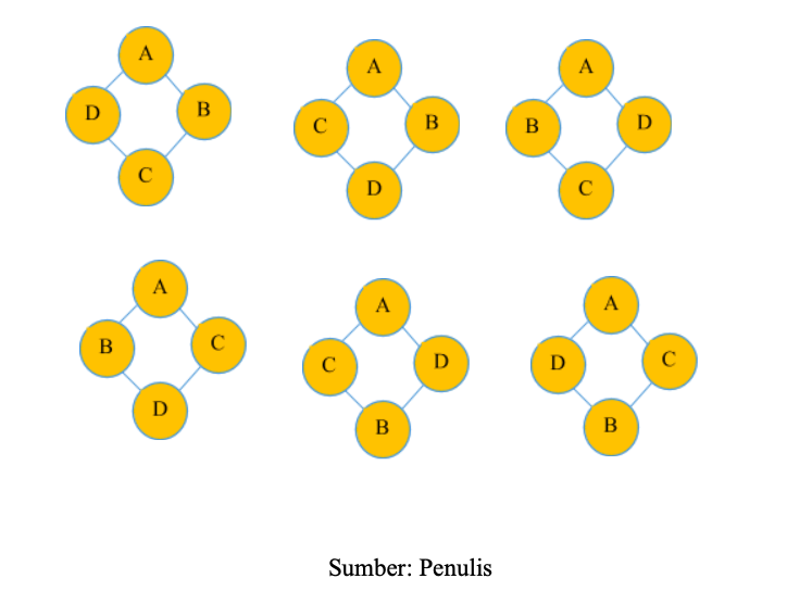 Berdasarkan soal diketahui, n= 4 (Andi (A), Boni (B), Cindi (C), dan Dodi(D))