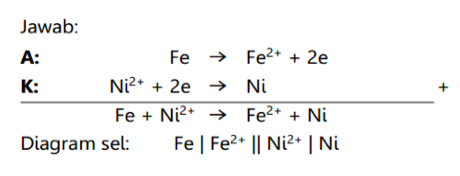 Contoh: Pada suatu sel volta, anoda besi tercelup pada FeSO4, katoda nikel tercelup pada NiSO4. Buatlah reaksi sel volta dan diagram selnya!