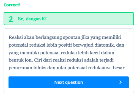 Reaksi sel volta dapat berlangsungspontanapabila nilai elektroda mempunyai nilai positif (+). Oleh sebab itu menggunakan rumus matematis elektroda dan diperoleh reaksi antara Br2dan KI karena nilai Elektrodanya (E0) = +0,45 V.