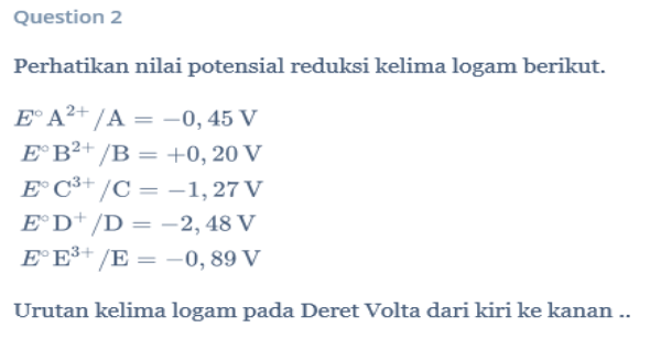 Sebagaimana kita ketahui bahwa deret Volta adalah suatu deretan unsur yang memiliki potensial yang berbeda dimana dari kiri dimulai dari elektroda yang negatif (-) menuju elektroda yang nilainya positif (+). Oleh sebab itu jawaban yang tepat dari soal no 3 adalah sebagai berikut.