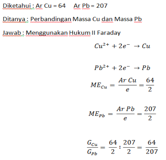 - Ada tipe soal di mana kita harus menggabungkan Hukum I dan II Faraday. Soal tersebut biasanya menentukan massa endapan yang terbentuk di katoda. Karena 1 Faraday = 1 mol elektron dan 1 mol elektron sama dengan 1 muatan 96.500 Coulomb, persamaan menjadi: