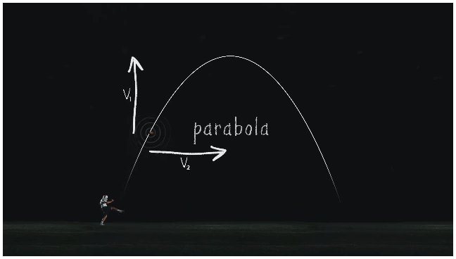 Ketika bola melayang di udara melalui lintasan berbentuk parabola, terdapat dua komponen kecepatan yang dimiliki oleh bola tersebut, yaitu kecepatan vertikal (v1) dan kecepatan horizontal (v2). Kedua komponen kecepatan tersebut dapat direpresentasikan sebagai vektor. Vektor merupakan besaran yang memiliki dua dimensi (nilai dan arah). Dalam hal ini, kecepatan merupakan vektor yang memiliki nilai kecepatan dan arah. Semakin besar kecepatannya, semakin panjang vektornya.