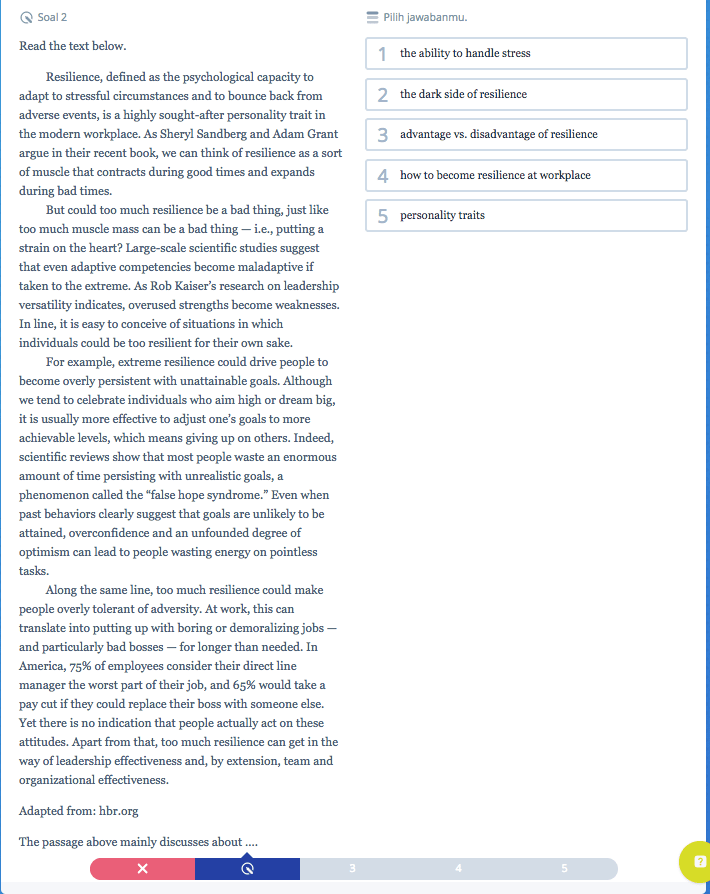 Berdasarkan kalimat pertama dari tiap paragraf teks ini, dapat diketahui bahwa topik teks adalah mengenai dampak negatif resilience (terutama resilience yang berlebihan), atau dengan kata lain, the dark side of resilience.