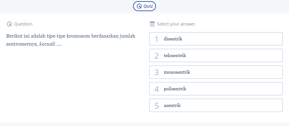 Berdasarkan jumlah sentromernya, kromosom dibagi menjadi empat tipe, yaitu: