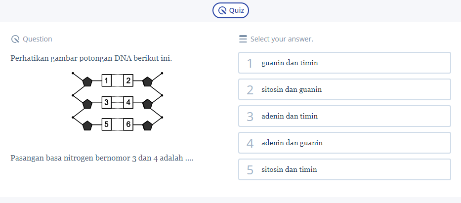 Pasangan basa nomor 3 dan 4 dihubungkan oleh tiga ikatan hidrogen, karena itu basa tersebut adalah sitosin dan guanin.