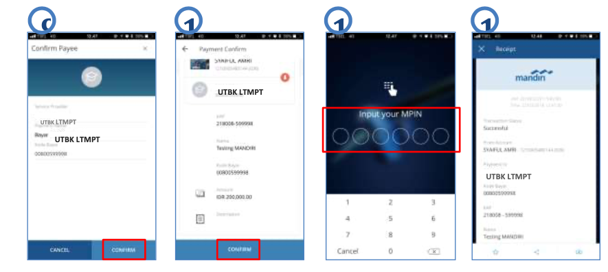 Pada menu, pilih layanan Pendaftaran, Institusi UTBK LTMPT, Input Kode Bayar, dan lanjutkan proses pembayaran. - Layar akan menampilkan inquiry respon. Kamu tinggal masukkan password transaksi dan lanjutkan proses pembayaran hingga muncul status ”Transaksi berhasil” sebagai bukti transaksi.