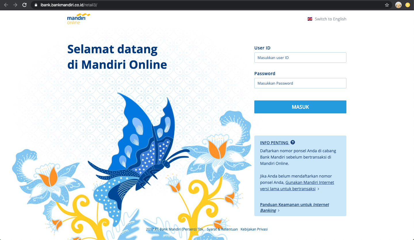 - Masuk ke website mandiri online https://ibank.bankmandiri.co.id/retail3, kemudian login dengan menginput User ID dan Password mandiri online kamu.