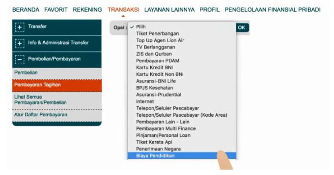 - Masuk ke menu Pembelian/Pembayaran -> Pembayaran Tagihan -> pilih Biaya Pendidikan.