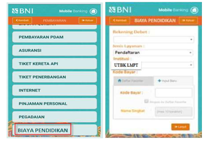 Pembayaran biaya UTBK tahun 2020 melalui Bank BNI dapat dilakukan melalui Teller Bank BNI, ATM BNI, SMS Banking (Syntax), SMS Banking (Menu), Keagenan, Mobile Banking, dan Internet Banking di seluruh wilayah Indonesia.