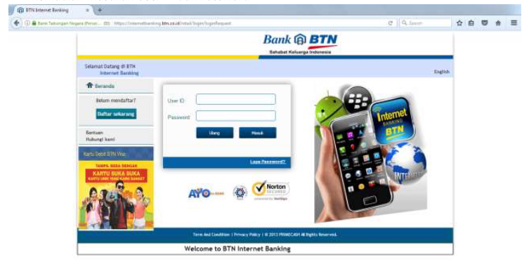 - Akses Web BTN Internet Banking melalui browser dengan alamat https://internetbanking.btn.co.id. Kemudian Masukan User ID dan Password.