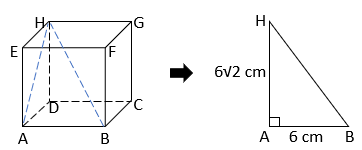 Rubiks cube pada soal dimisalkan sebagai kubus ABCD.EFGH dengan panjang rusuk 6 cm. Salah satu diagonal ruang kubus tersebut adalah BH. Jika diperhatikan lebih lanjut, BH memiliki hubungan dengan diagonal sisi AH dan rusuk AB, yaitu ketiga sisi membentuk segitiga siku-siku ABH seperti berikut: