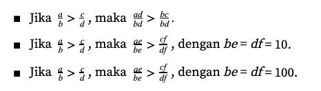 Jika premisnya lebih dari dua, kamu bisa menggunakan garis bilangan kedua untuk memperkirakan letak bilangan tersebut. Nah, jika bilangannya berupa pecahan, kamu bisa menyamakan penyebutnya dengan KPK kemudian urutkan pembilangnya. Perhatikan contoh berikut.