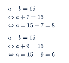 Berdasarkan persamaan (1), yaitu a + b = 15, pasangan nilai a dan b yang mungkin adalah 8 dan 7, 7 dan 8, 9 dan 6, atau 6 dan 9. Oleh karena itu, semua nilai b yang mungkin adalah 6, 7, 8, dan 9. Dengan demikian, diperoleh: