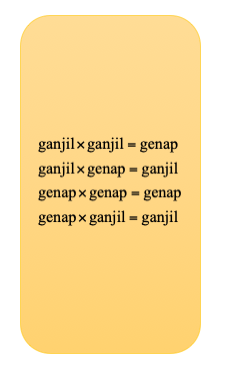 Jika kamu menemukan soal di mana bilangan ganjil ditambah atau dikurangi bilangan genap, maka hasilnya sudah pasti bilangan ganjil. Namun, jika bilangan ganjil ditambah atau dikurangi bilangan ganjil, hasilnya berupa bilangan genap. Untuk perkalian, berlaku konsep berikut.