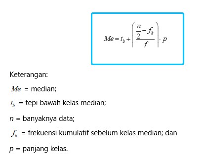 Secara matematis, median data berkelompok dirumuskan sebagai berikut.