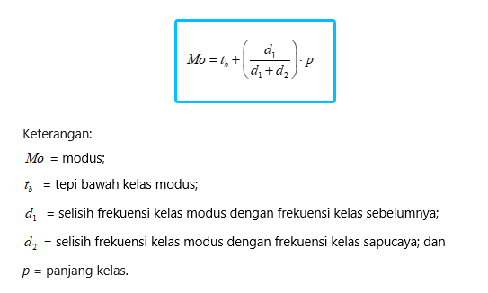 Secara matematis, modus data berkelompok dirumuskan sebagai berikut.