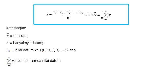 Mean atau rata-rata adalah semua nilai datum dibagi banyaknya datum. Datum adalah data yang diperoleh dari hasil penelitian atau observasi. Mean atau rata-rata dibagi menjadi tiga juga, yaitu sebagai berikut.