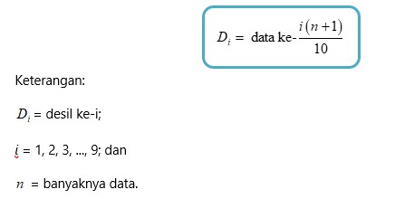 Jika sebelumnya Quipperian sudah belajar tentang kuartil yang membagi data menjadi empat bagian sama besar, maka kali ini kamu akan belajar desil. Desil membagi data terurut menjadi 10 bagian sama besar. Adapun rumus untuk menentukan desil adalah sebagai berikut.