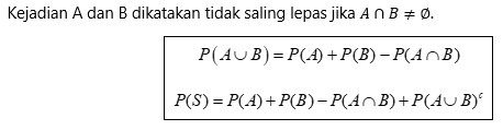 Jika kejadian A dan B tidak bisa terjadi secara bersamaan, maka peluang kejadian A dan B saling lepas. Secara matematis, dirumuskan sebagai berikut.