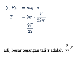 Dua benda, A dan B, berada di atas lantai licin dan keduanya dihubungkan dengan seutas tali. Benda A bermassa 13m dan benda B bermassa 9m. saat kedua benda bergerak akibat benda B dikenai gaya F, tali penghubung antara kedua benda itu menegang sebesar T. Besar tegangan tali T tersebut adalah…