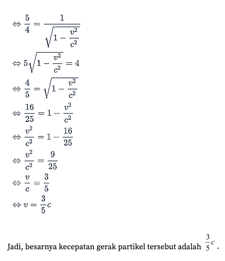 Sebuah partikel bermassa diam m0 bergerak sehingga energi diamnya empat kali energi kinetiknya. Besarnya kecepatan gerak partikel tersebut adalah…