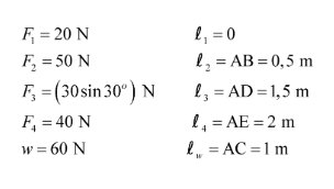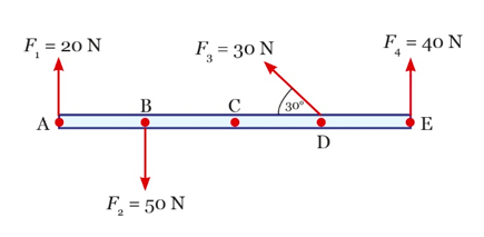 Sebuah batang AE bermassa 6 kg memiliki panjang 2 m dikenai 4 gaya seperti gambar berikut.