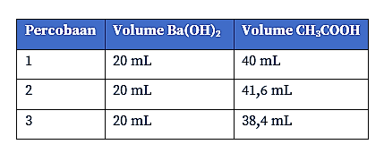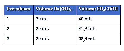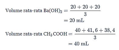 Berikut ini merupakan data hasil titrasi Ba(OH)2 dengan larutan CH3COOH 0,2 M.