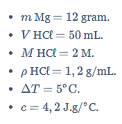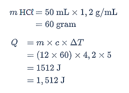 Sebanyak 12 gram logam Magnesium (Ar Mg = 24) direaksikan dengan 50 mL larutan HCl 2 M (massa jenis = 1,2 g/mL). Larutan hasil reaksi mengalami kenaikan suhu sebesar 5o C. Jika kalor jenis larutan adalah 4,2 J.g/oC, perubahan entalpi reaksi tersebut adalah ….