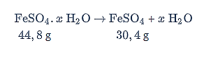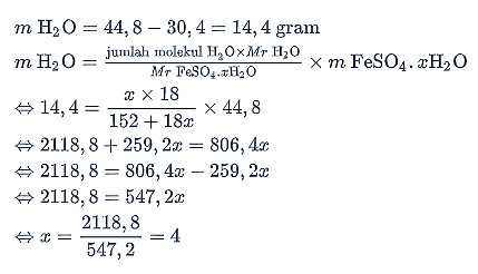 Pemanasan 44,8 kristal besi (II) sulfat hidrat (FeSO4.xH2O) menghasilkan 30,4 gram kristal anhidrat. Jika massa molar FeSO4 = 152 g/mol dan Mr H2O = 18 g/mol, rumus molekul kristal hidrat tersebut adalah…
