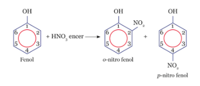 Jika fenol direaksikan dengan HNO3 encer, akan terjadi substitusi atom H yang terikat oleh atom C nomor 2 atau 6 dan 4 dari cincin benzena dengan gugus nitro (−NO2). Berikut ini mekanisme reaksi fenol dengan asam nitrat encer.