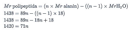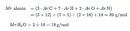 Polipeptida dihasilkan dari polimerisasi kondensasi dari asam amino. Pada reaksi kondensasi setiap penggabungan molekul asam amino disertai dengan pelepasan 1 molekul air (H2O). Tentukan Mr dari alanin dengan persamaan berikut.