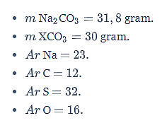 Jika dari reaksi tersebut dihasilkan 30 gram XCO3, massa atom relatif dari unsur X adalah … (Ar Na = 23; C = 12; S = 32; dan O = 16)
