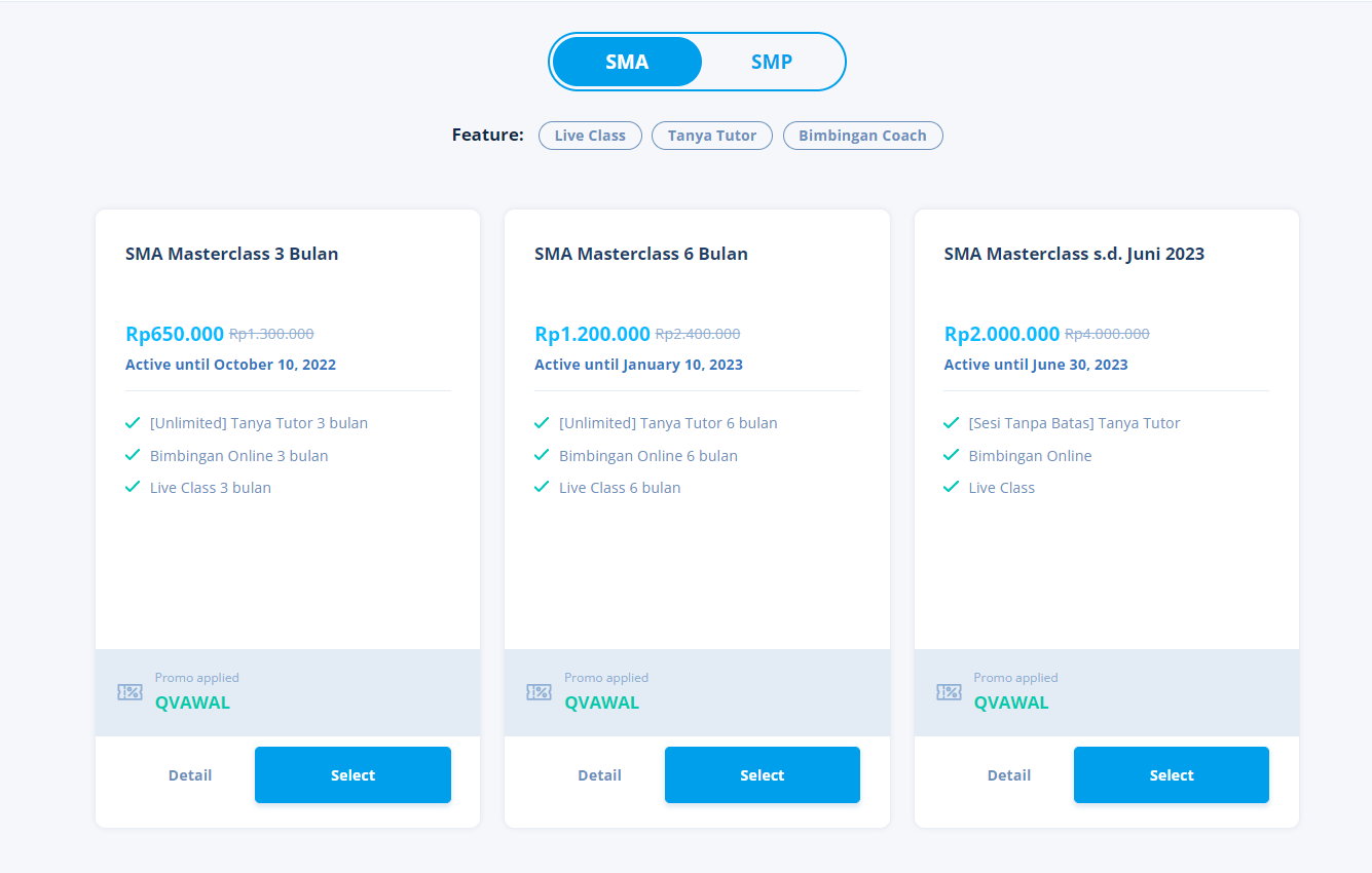 Nah, di sini kamu bisa melihat harga untuk upgrade Quipper Video Masterclass.