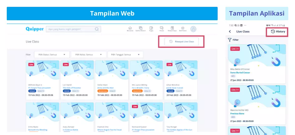 Nggak usah panik, nggak usah khawatir. Kamu bisa kok lihat rekamannya dari fitur “Riwayat Live Class”! Di sini, semua rekaman dari Live Class yang sudah lihat bisa kamu lihat, hanya dengan klik Live Class yang ingin kamu tonton ulang, lalu klik ikon Play.