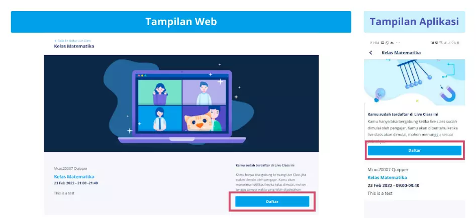 Kamu hanya perlu klik pada Live Class yang ingin kamu ikuti, lalu klik tombol “Daftar” yang berwarna biru. Dengan begitu, akunmu akan otomatis terekam oleh sistem Quipper & kursimu otomatis tersimpan!