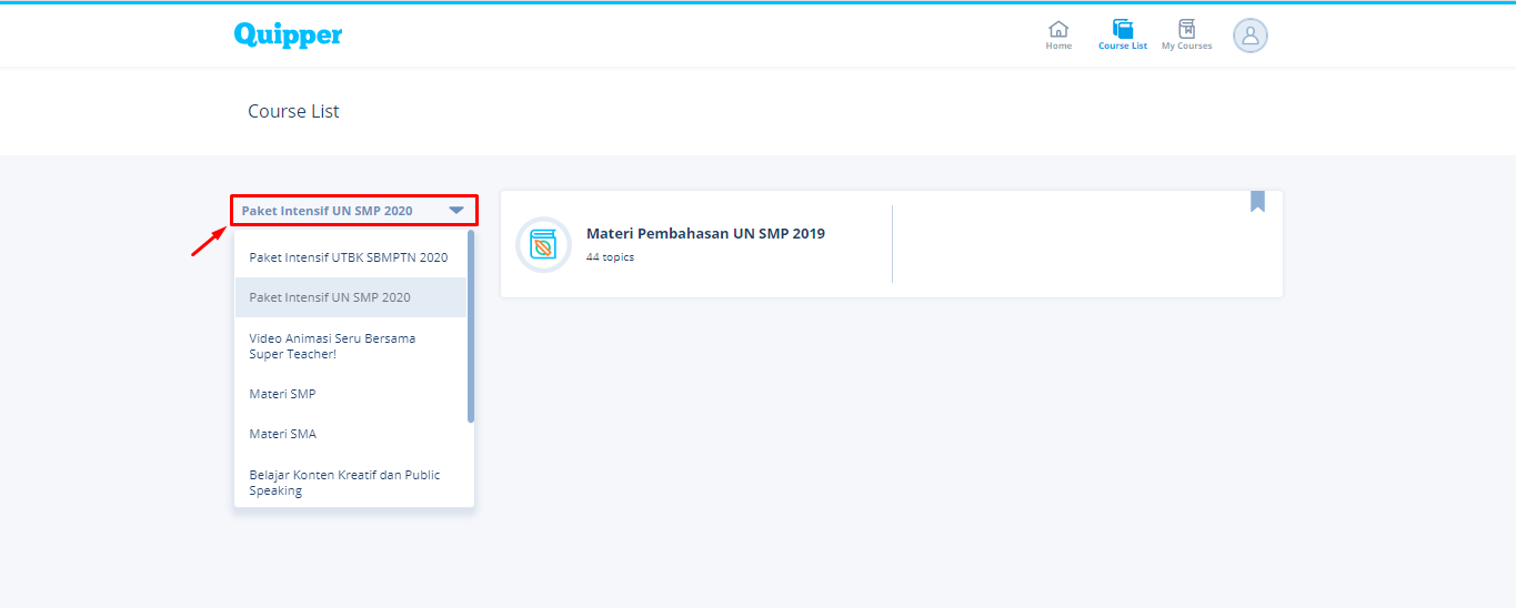 Jika kamu sudah berada di halaman Course List, pilih materi yang ingin kamu pelajari melalui Daftar Materi seperti pada gambar. Pilih “Paket Intensif UN SMP 2020” untuk mengakses materi-materi khusus untuk persiapan UN SMP 2020 mendatang.
