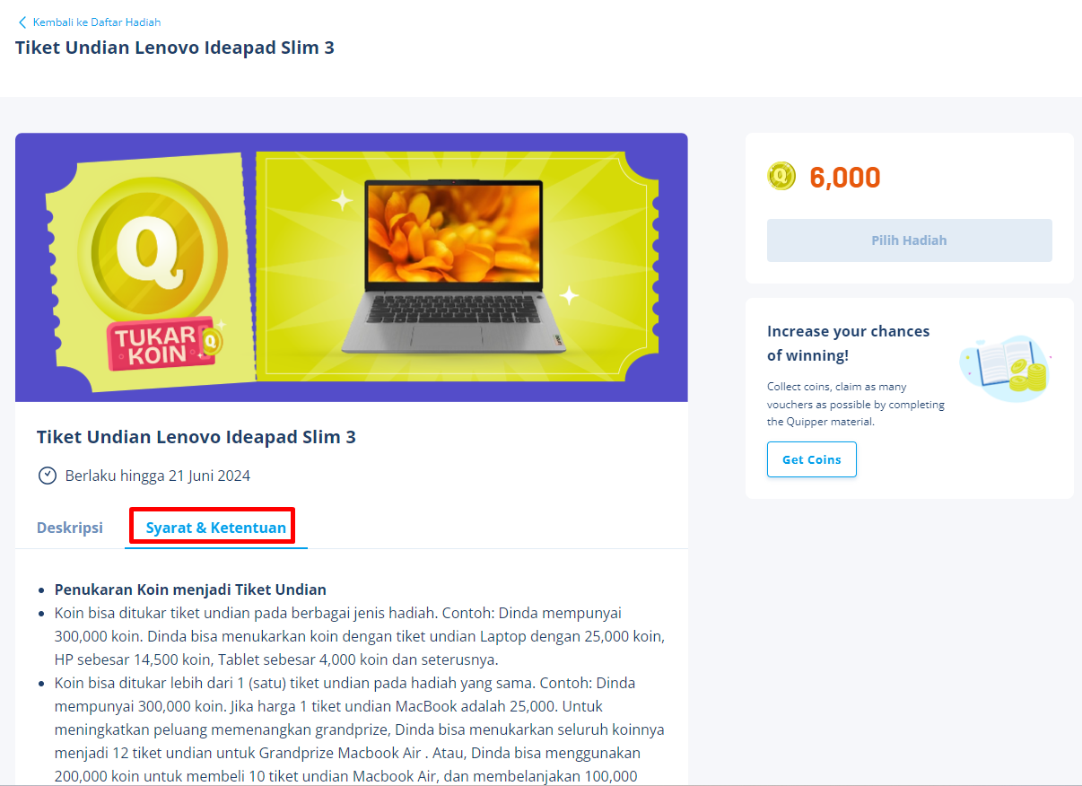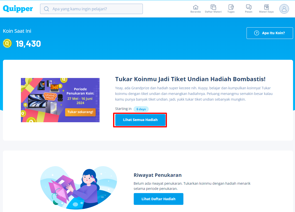 Penasaran hadiahnya apa aja? 😎 Klik link ini buat kepoin semua hadiahnya yuk! Worth it gak nih? Cuma ambis belajar bisa dapetin hadiah sekeren itu. Worth it banget dong. Oiyaa periode tukar Koin berlangsung mulai Senin, 27 Mei 2024 pukul 16.00 WIB sampai Minggu, 16 Juni 2024 pukul 23.59 WIB. Please, jangan sampe ketinggalan, Quipperian! Penukaran koin hanya bisa melalui website learn.quipper.com (mobile web atau PC/laptop). Berikut langkah penukaran tiket undian dengan koin yang sudah kamu kumpulkan.