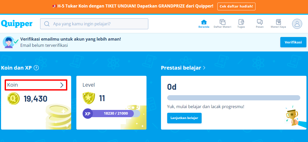 - Login melalui website learn.quipper.com ya! Jumlah Koin dan XP-mu akan langsung terlihat di halaman Beranda, klik ikon atau widget “Koin”