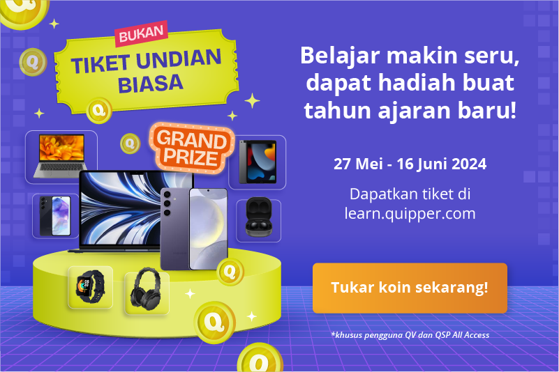 Tahun ajaran baru, dapet hadiah baru? Siapa mau? Aku mauuu… Jangan lupa tukar Koinmu dengan tiket undian sebanyak-banyaknya~ Makin banyak tiket undianmu, makin tinggi peluangmu menang, lho. Siswa yang berhak dan bisa tukar koin dengan tiket undian antara lain siswa QSP All Access dan Quipper Video ya. Tetap semangat untuk kamu yang belum bisa atau eligible ikutan tukar Koin Quipper! 💪💪💪