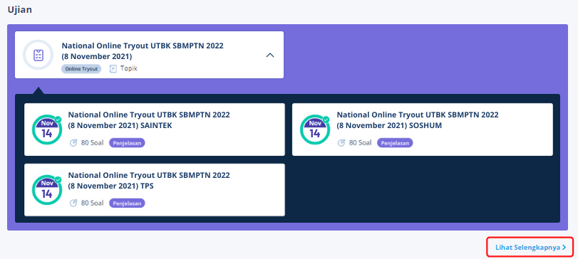 - Pada bagian “Ujian” di halaman Beranda, klik tombol Lihat Selengkapnya.