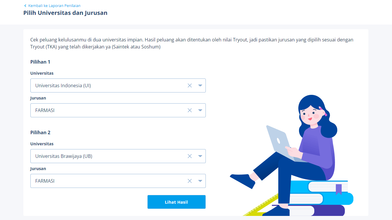 - Masukkan 2 pilihan universitas & 2 jurusan yang ingin kamu uji peluangnya (untuk hasil yang lebih akurat, masukkan jurusan sesuai kelompok ujian yang kamu kerjakan ya!), lalu klik Lihat Hasil. Pengisian pilihan universitas & jurusan tidak memiliki batas waktu jadi kamu bisa Cek Peluang kapanpun yang kamu mau, ya!