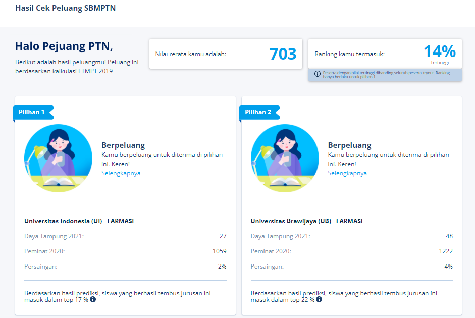 Gimana, gampang banget kan? Setelah hasil Cek Peluang keluar, kamu bisa langsung tahu prediksi peluangmu untuk lolos berdasarkan nilai tryout yang kamu miliki, & evaluasi kira-kira materi apa yang masih jadi kelemahanmu, untuk kamu perbaiki di tryout berikutnya. Selain itu, kamu juga akan diberikan rekomendasi kampus yang sesuai dengan jurusan yang kamu pilih, yang bisa kamu pertimbangkan untuk jadi pilihan di SBMPTN aslinya nanti lho!