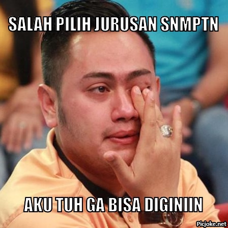 “Ya ampun, Cin. Benar sekeleus” sahut para peserta pelamar SNMPTN. Hahaha. Pasti meme ini mewakili perasaan Quipperian semua peminat jalur SNMPTN. Kepingin pilih jurusa, misalnya A, tapi peminatnya banyak banget, dan lebih para lagi, daya tampung cuma sepuluh. Syedih. Pilihannya cuma, terus berjuang melawan ratusan bahkan ribuan peserta, atau banting stir pilih jurusan lain. Semua ada di tangan Quipperian.