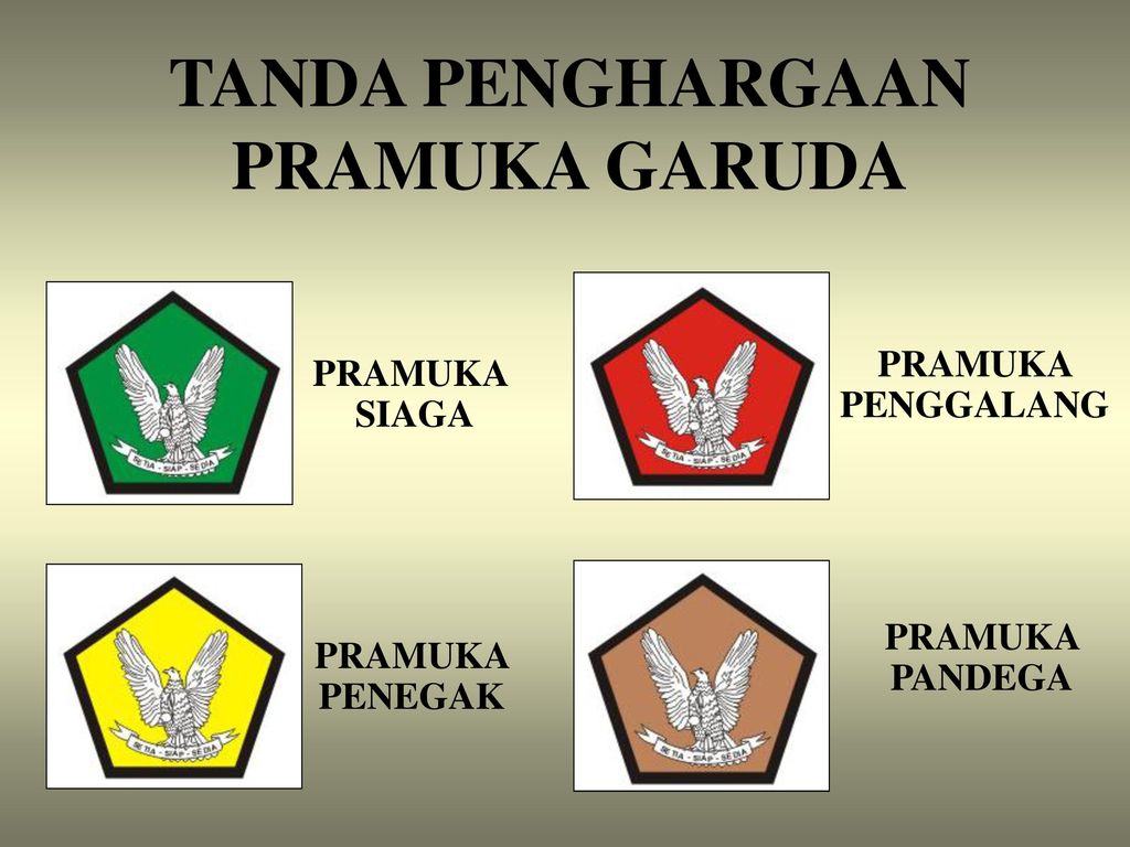 Tanda Pramuka Garuda, terdiri atas lima golongan, antara lain Garuda Hijau untuk golongan Siaga, Garuda Merah untuk Penggalang, Garuda Kuning golongan Penegak, Garuda Perak untuk Pandega, dan Garuda Emas untuk pemeroleh tiga kali Pramuka Garuda pada golongan berbeda.